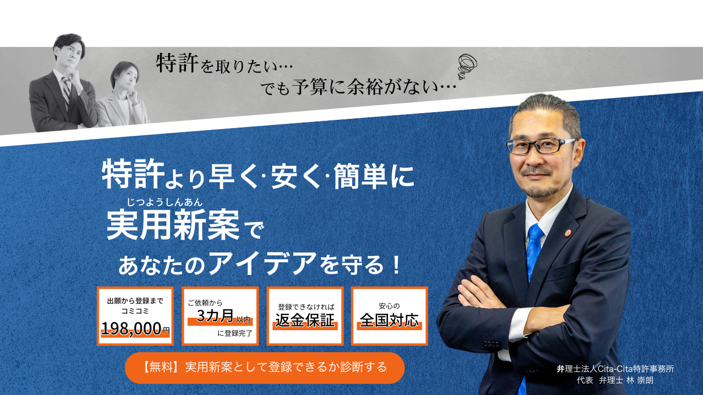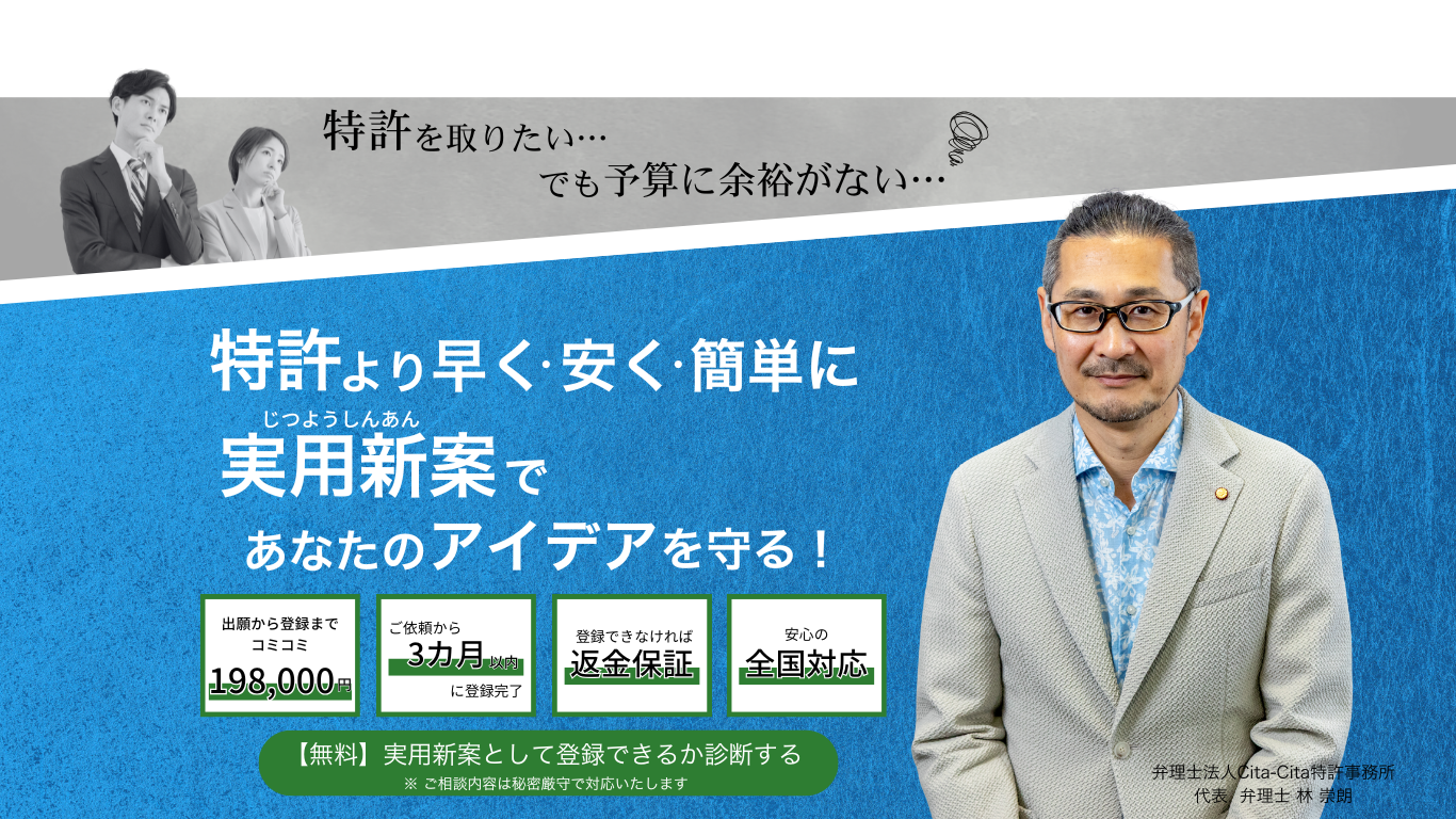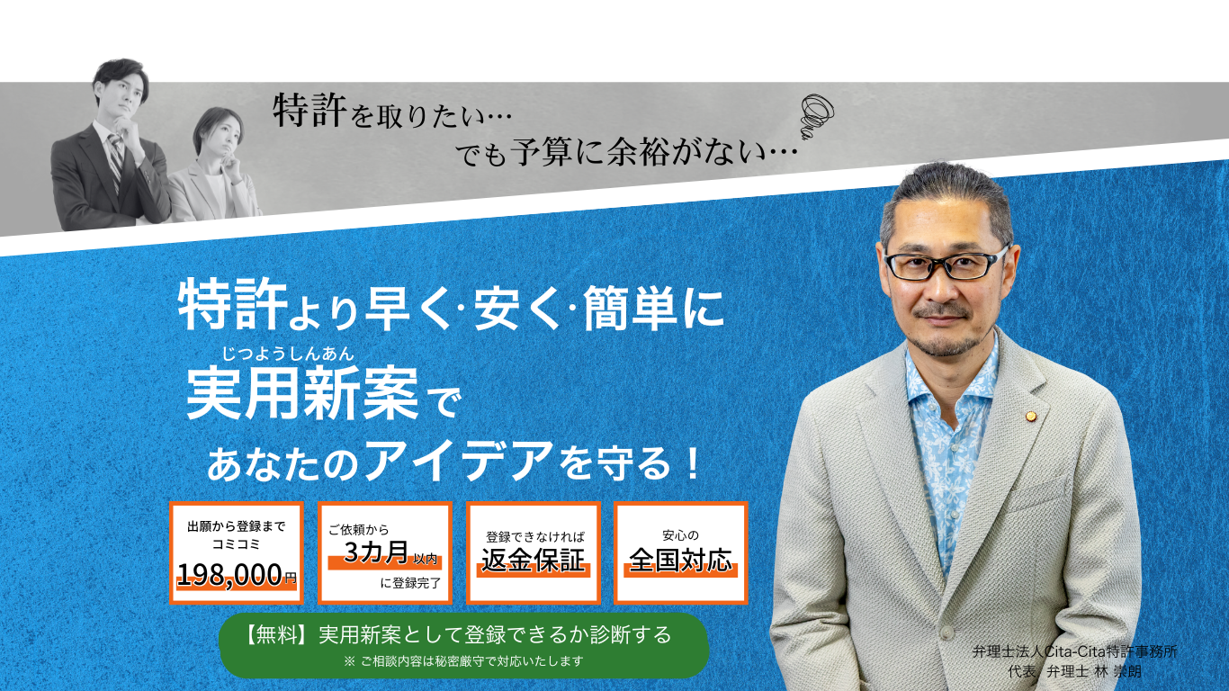 返金保証付き198,000円での実用新案のご依頼を毎月5件に限定しております。